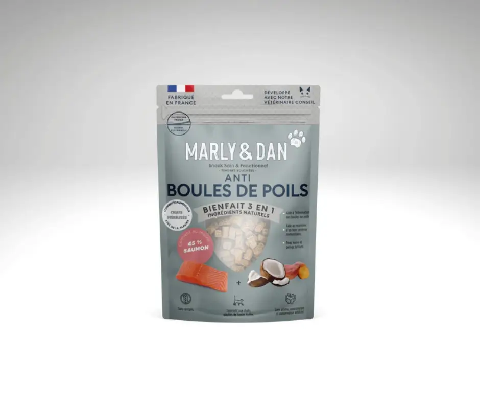 A grain-free treat for cats in the form of soft bites made with salmon and natural plant ingredients. These snacks are specially formulated to help prevent the formation of hairballs in cats. Enriched with natural fibers and enzymes, they facilitate the passage of ingested hair through the digestive system, reducing vomiting and discomfort. Made in France and rich in salmon, these "Anti-Hairball" Treats offer a tasty and appetizing solution for your feline's well-being.